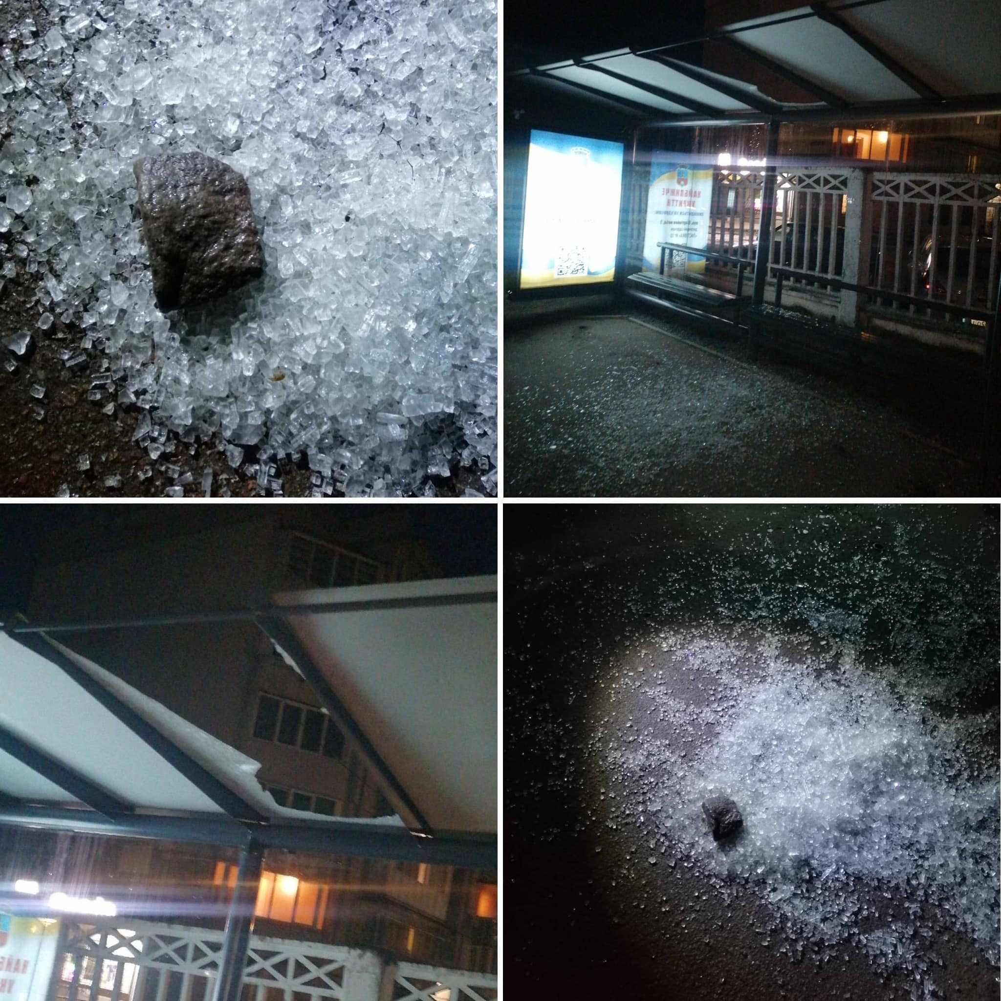 Саме так, як зображено нижче на фото, виглядала зупинка громадського транспорту вранці 8 лютого. Невідомі вщент розбили одну скляну секцію розташовану на даху павільйону використавши для цього каміння.
