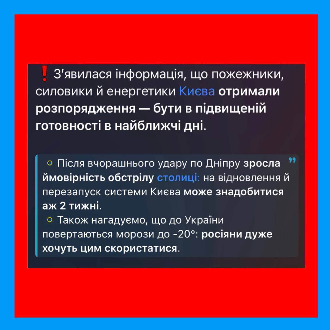 За наявною інформацією, через посилення загроз обстрілів та ускладнення погодних умов, зокрема очікуване зниження температури до –20°, можливі додаткові навантаження на об’єкти критичної інфраструктури та комунальні мережі.