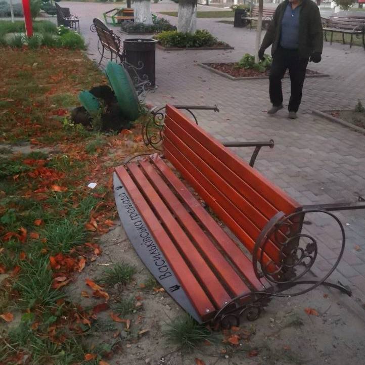 А ось і наслідки проведення активного відпочику. На фото ми можете спостерігати перекинуту лавку та чашу для квітів в сквері ГОЛОВАЧОВА. Що при цьому відчували ті, хто спромігся на таке? Гордість? Захват? Невже немає ні краплі совісті…