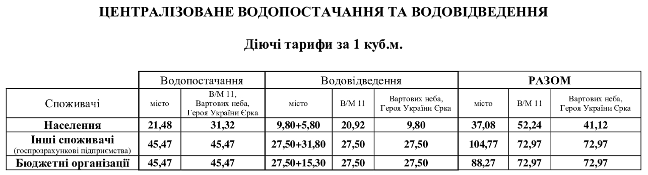 На даний час послуги з централізованого водопостачання та водовідведення населенню міста Василькова надаються за тарифами встановленими: