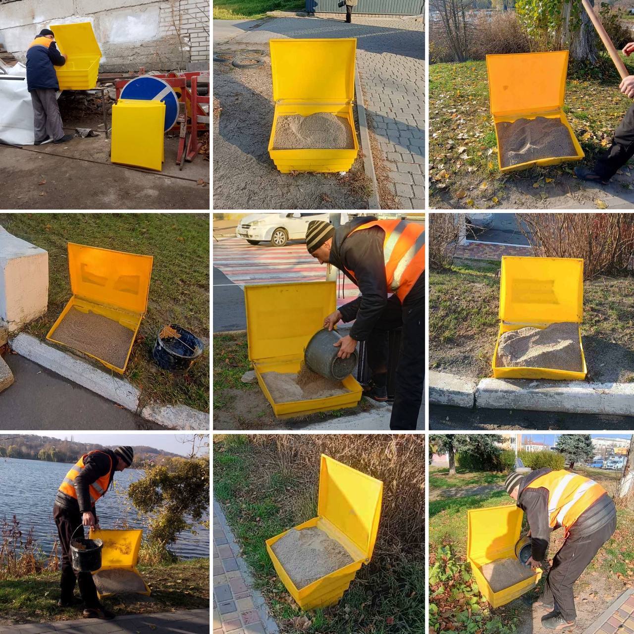 Працівники благоустрою КП «ККП м. Василькова» активно розпочали підготовчі роботи до зимового періоду. Одним із ключових завдань стало заповнення спеціальних контейнерів для зберігання піщано-сольової суміші у місцях масового скупчення людей.