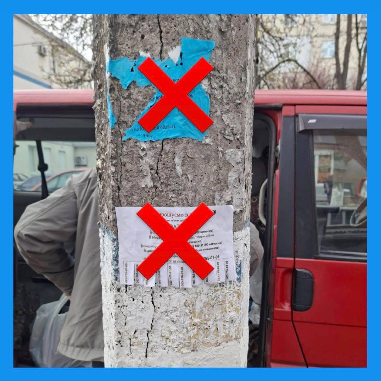 Стовпи, зупинки громадського транспорту, паркани, урни, опори освітлення та інші елементи благоустрою — це не місце для вашої реклами. Кожне таке «оголошення» — це бруд, який псує вигляд нашого міста та створює додаткову роботу комунальним службам.