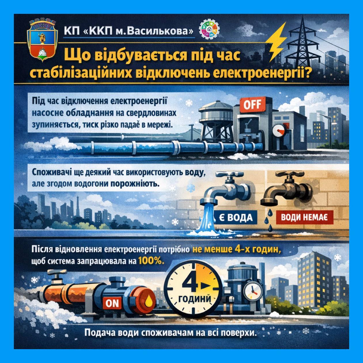 Після відновлення електроенергії та запуску насосного обладнання необхідно не менше 4-х годин, щоб система водопостачання запрацювала на всі 100% для подачі води споживачам в т.ч. на верхні поверхи багатоквартирних житлових будинків. В разі повторного відключення електроенергії під час заповнення системи водопостачання поповнення системи почнеться з початку після повторного включення електроенергії. На даний час КП «ККП м.Василькова» забезпечило генераторами свердловини (які було технічно можливо), але це становить приблизно 40% від загальної кількості свердловин, що здатні лише на деякий час підтримувати тиск в мережі водопостачання, на декілька годин, в залежності від терміну відключення електроенергії.