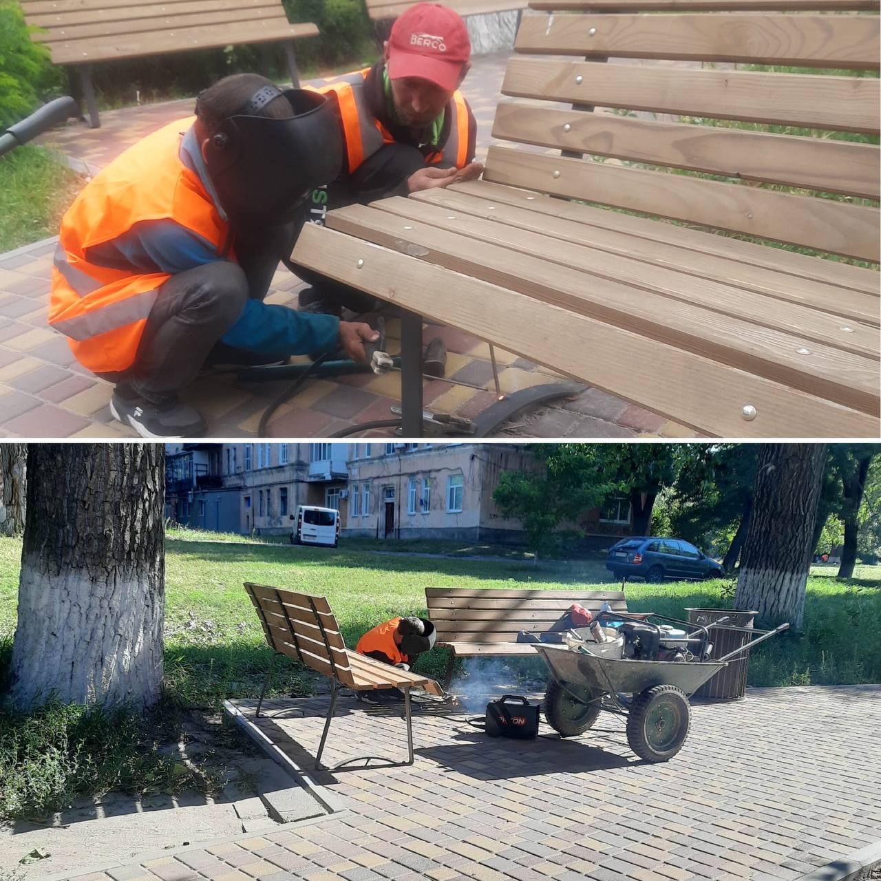 Другий день поспіль, працівники дільниці благоустрою КП «ККП м.Василькова» ремонтують пошкоджені в наслідок вандалізму лавки та урни у В/М 11.