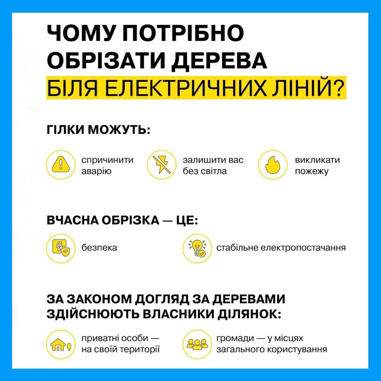 Тож якщо на вашій ділянці ростуть дерева під повітряними лініями, не допускайте їх заростання. Вчасно підрізані гілки – це спокій, безпека та світло в домівках.